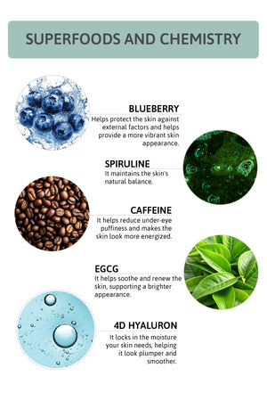 Ornate Eye Cream offers effective care against signs of fatigue around the eye area with its rich formula containing blueberry, spirulina, caffeine, and EGCG. Caffeine helps reduce the appearance of puffiness and under-eye bags, while EGCG and spirulina provide antioxidant support to the skin. Blueberry helps brighten the under-eye area and minimize the appearance of dark circles.