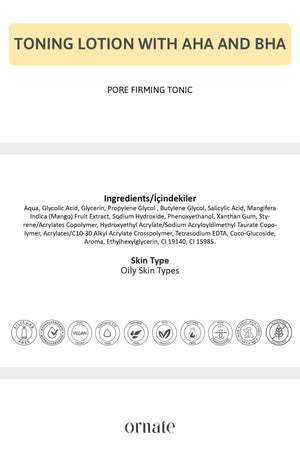 Ornate AHA BHA Toner helps reduce the appearance of blackheads, acne, and blemishes while promoting a more even skin tone and a smoother-looking complexion. Enriched with mango extract, its formula helps soothe, refresh, and revitalize the skin. Salicylic Acid (BHA) works to purify pores, while Glycolic Acid (AHA) gently exfoliates dead skin cells from the surface of the skin.